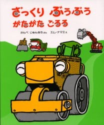 でこぼこ原っぱをたいらにしようと、4台の作業車が協力します。それぞれの車の働きもわかる、のりもののお話絵本です。