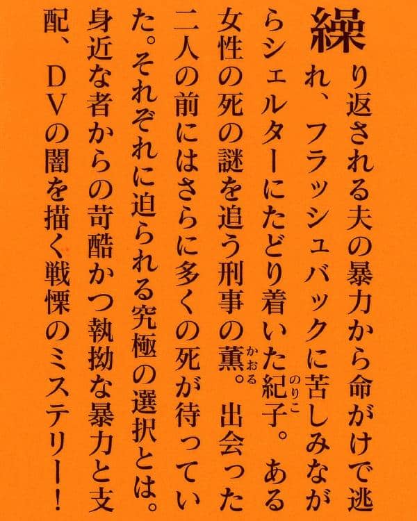 四日に一人、妻が夫に殺される。DV(ドメスティック・バイオレンス)−−声を上げられない被害者たちが、今日もどこかで心と体に瀕死の重傷を負っている。暴力夫から命がけで逃れ、風変わりなシェルターにたどり着いた紀子。その家には、ある一つの「ルール」があった。江戸川乱歩賞作家が「ドメスティック・バイオレンス」をテーマに描いた衝撃作。