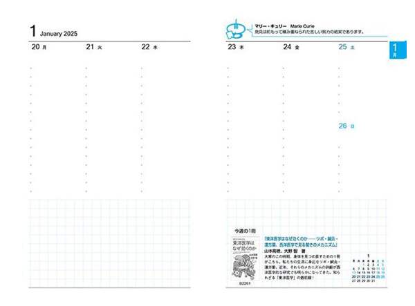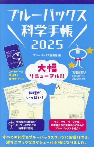 今年は、資料編の内容を大幅刷新。物理特集を充実させ、一般の読者から研究者まで傍らに置きたくなる内容に。●主な内容スケジュール帳(年間スケジュールと週間スケジュール)週間スケジュールには、科学者たちの名言やその週のおすすめブルーバックスを1冊紹介。毎日が飽きなくなる手帳。