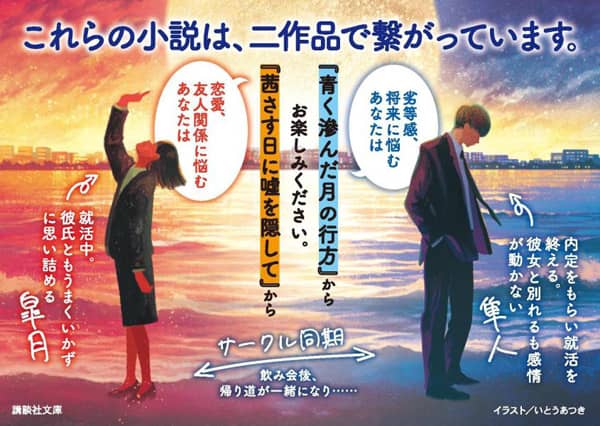 何事も器用にこなす隼人は就活を終えるも、憧れの職業を目指すサークル同期・皐月に劣等感を感じる。暇つぶしのように異性を弄ぶ大地、将来の道を選び取れない和弘、他人の不幸を利用して脚本を書くB。理想の自分に向かって「大人未満」のままもがく、『茜さす日に嘘を隠して』と繋がる青春群像共作。 |