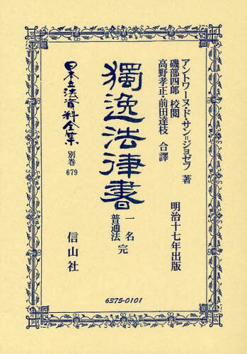 アントワーヌ・ド・サン=ジョゼフ(1794-1853)が著したConcordance entre les codes civils etrangers et le Code Napoleon、 2eme ed、.1856が原著。原著でフランス語訳されたドイツ普通法を邦訳したのが本書。校閲者は磯部四郎(1851-1923)、訳者は高野孝正・前田達枝(両者とも、生没年を含め、経歴詳細は調査中)。