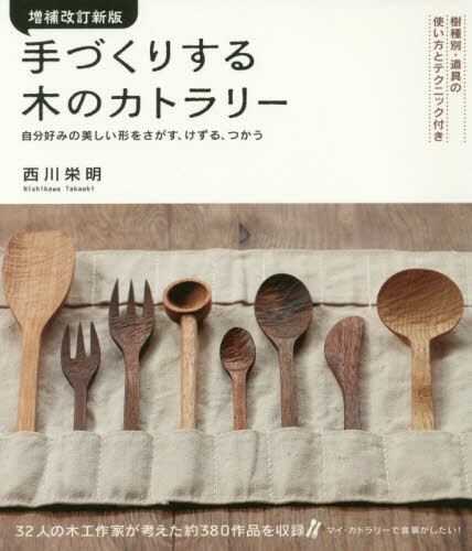全国各地の木工作家32人が自ら使い勝手を試しながら完成度を高めていった、木のカトラリー(フォークやスプーンなど)、器、皿、箱(バターケースなど)、カッティングボード、へら、しゃもじ、バターナイフ、箸、箸置きなどを約380点紹介し、それらのカトラリーや豆皿などの作り方も紹介した本です。作品紹介は、たんに作品をカタログのように並べるのではなく、木工作家の作品への想い、製作にあたってのポリシーや、作ることになったきっかけなどに迫ります。木のカトラリーは「使う」道具であり、芸術鑑賞作品ではありませんので、実際に作ったカトラリーで食事をする写真なども掲載しています。さらに、木工初心者の方でもカトラリーづくりができるように、木工作家がわかりやすく指導する「つくってみませんか」のコーナーを9カ所設けています。自分好みの大きさ・形につくる楽しさ、そして実際に使う楽しさを知ることができる「木のカトラリー」に絞った本です。※本書の初版は、2009年発行の『手づくりする木のカトラリー』。2013年には、4人の木工作家をプラス取材し増ページした増補改訂版が刊行されました。さらに、増補改訂版に2人の木工作家を追加して紹介し、「木の種類別の彫刻刀の使い方」「南京鉋の使い方」などの項目も新たに掲載。2017年3月、本文176ページの増補改訂新版として刊行。※掲載木工作家: 臼田健二、老泉まゆみ、沖原紗耶、大久保公太郎、片岡祥光、加藤慎輔、川合優、川端健夫、金城貴史、久保田芳弘、さかいあつし、酒井邦芳、佐藤佳成、須田修司、大門巌、高橋秀寿、田中孝明、玉元利幸、丹野則雄、富井貴志、富山孝一、難波行秀、西村延恵、萩原英二、般若芳行、日高英夫、堀内亜理子、前田充、松本寛司、山極博史、山下純子、山本美文