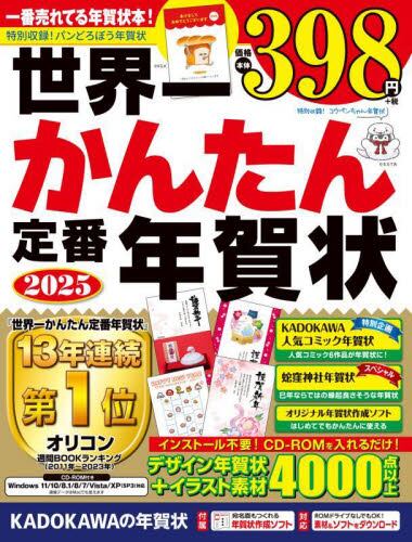 「本当にかんたんだった!」と毎年大好評の年賀状素材集。お手頃価格なのに、かわいいデザインから落ち着いたデザインまで幅広い年齢の方にピッタリの素材が4000点以上。2025版では、「白蛇日本三大聖地」として知られる蛇窪神社のお守りやご朱印帳のデザインを年賀状デザインにして収録!人気作家年賀状では、ふんわりかわいいデザインが老若男女に好評のイラストレーター「小倉マユコ」の年賀状デザインを掲載。フォーマルから定番、はなやか、大人おしゃれやエコなどの年賀状デザインのほか、追加して使えるイラストパーツも多数収録。寒中見舞いや欠礼状もあり、これ1冊で家族全員分の挨拶状がつくれます。ポチ袋や富士山カレンダー、フォトフレームカレンダー、毛筆フォントなど一年中使える便利な特典も充実。大人気の「コウペンちゃん年賀状」や、人気コミックの1シーンが年賀状になった「KADOKAWA人気コミック年賀状」など、KADOKAWAならではの楽しい企画もいっぱい!Webアンケートに答えると豪華賞品があたるプレゼント企画もあります。LINEやSNSなどで送れるメッセージ付きイラスト「あけおめキャラピクチャー」も収録。Web上からソフトを含むはがきデザインをダウンロードできるサービスもあるから、ROMドライブがなくても使えます(一部デザインを除く)。